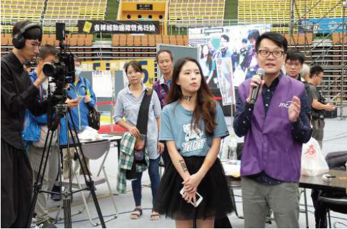金屬積木自走車接力賽的精彩實況吸引無數觀眾留步觀賽,密密麻麻的人群圍成一堵人形立牆,十分壯觀,為了讓賽事順利進行,工作人員不得不隨時提醒民眾與場地保持適當距離,可見競賽之熱鬧刺激。