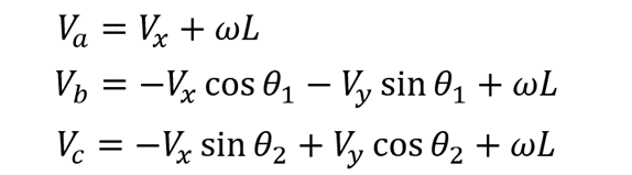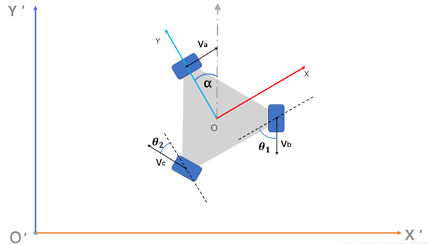三個全向輪馬達架設的夾角都為120度,世界坐標系為X’O’Y’以底盤自身XOY坐標系,移動平臺自身的角速度爲ω,設順時針爲角速度正方向,各個輪子的速度分別爲Va、Vb、Vc,移動平臺在自身座標系下的分速度爲Vx、Vy,夾角θ₁ = π / 3,θ₂ = π / 6 。α是兩個座標系的夾角,可以列出每個輪子分別的速度。