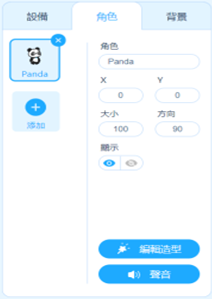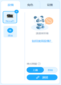 點開mBlock會看到左上方有一個角色視窗,左下方為角色狀態欄可以選擇設備、角色、背景用來切換程式頁面分別對於那個角色撰寫。