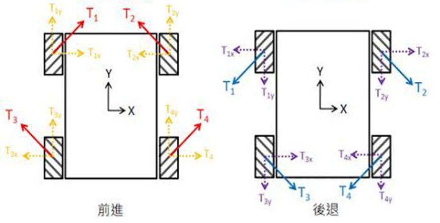 四個麥克納姆輪馬達架設的夾角都為相對應架設,麥克納姆輪四個輪子為一組分別有各兩顆左旋輪、右旋輪,旋轉時會產生一個45度方向的分力如下圖T1,根據要朝哪個方向來分配四顆馬達旋轉的速度,不同方向的分力相互底銷後即朝向目標方向移動。
