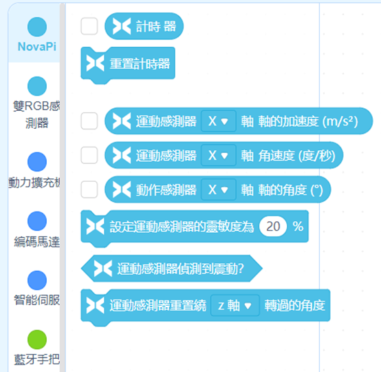 中間有一欄可以選擇不同程式方塊集,下方有個延伸集可以加入不同的程式方塊或是感應器方塊,右方會出現對應的程式方塊選單