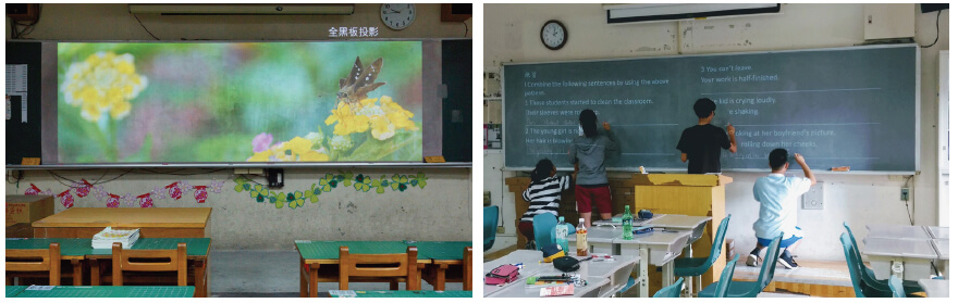 全黑板投影技術可以直接把簡報畫面投影在整個黑板上,老師和學生可以在投影出來的畫面上,直接用粉筆畫記或寫字。