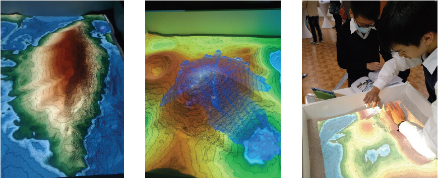簡單來說,AR 沙箱是一個裝了沙子的大盒子,結合3D 攝影機即時偵測沙子的造形變化,將彩色的等高線圖透過單槍投射在沙子上,學生可以很直覺的看到並瞭解地形變化,除等高線圖外,還有額外功能如降雨、降雪、岩漿……,如下列三張圖。