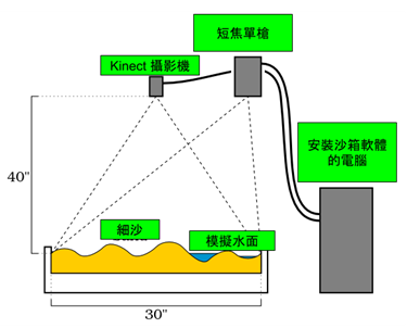 如果想做不同尺寸的沙箱,基本上只要依4:3 的比例改變大小即可,但請注意若沙箱放大,就要將Kinect 感應器拉高,才能涵蓋更大面積,但如此一來 Kinect 感應器分辨解析度就會變差。所以目前100cm × 75cm 的面積,應該是經UC Davis 測試過後,在品質可接受的條件下的最佳大小。