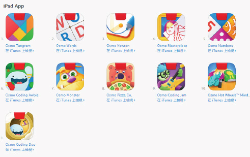 OSMO 目前有9 個App, 包含Numbers、Tangram、Words、Masterpiece、Newton、Monster、Coding Awbie、Coding Jam 與Pizza co.,以下根據套件來說明: