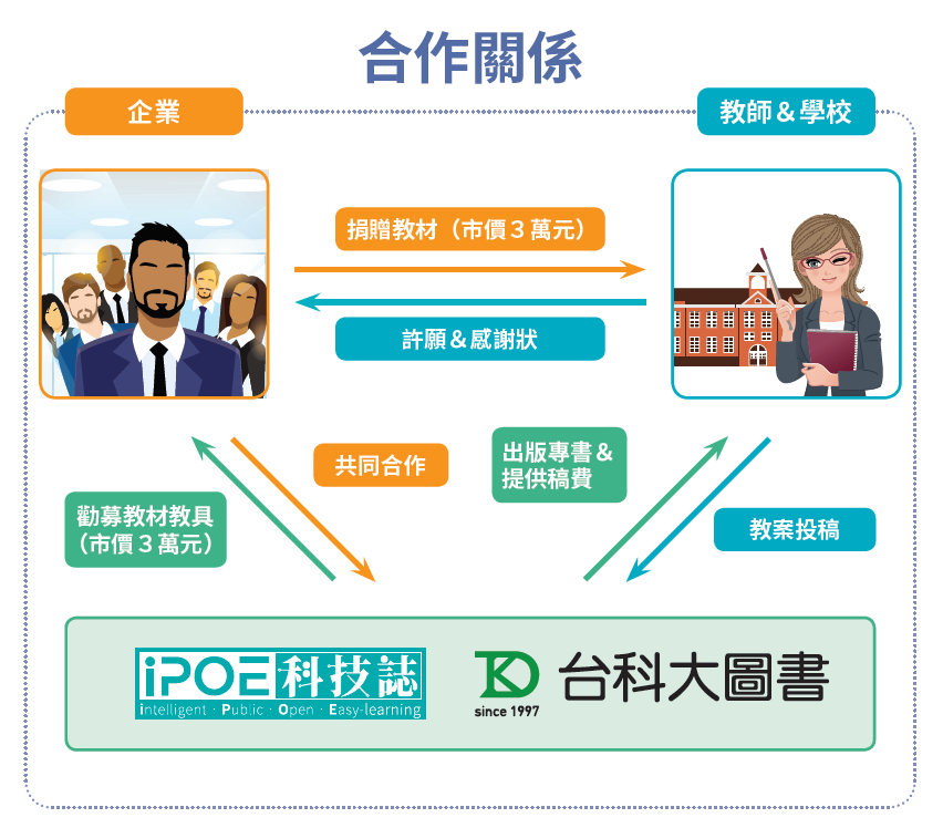 《iPOE科技誌》會根據這些許願單,向企業單位勸募清單上的教材教具,捐贈給得獎教師所任教的學校。為了感謝廠商的熱心公益,《iPOE科技誌》亦邀請得獎學校頒發感謝狀予企業,感謝企業為教育共同付出的心血努力。