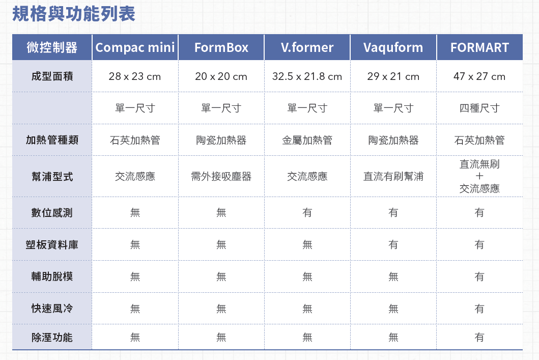 FORMART擁有桌上型機種最大的成型面積,亦提供獨創的塑膠板自動辨識、四種尺寸快速切換、吸力調整功能、吐氣脫模功能、加熱曲線調整功能、自我偵錯功能,完善機能甚至超越工業級設備!附帶的塑板除溼功能,對於氣候潮濕的台灣更是一項十分貼心的設計,也因此讓FORMART在台灣贏得一大批支持粉絲。雖然FORMART擁有極為豐富的功能,但定價僅$64890元台幣,CP值相當高。