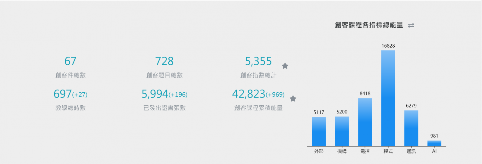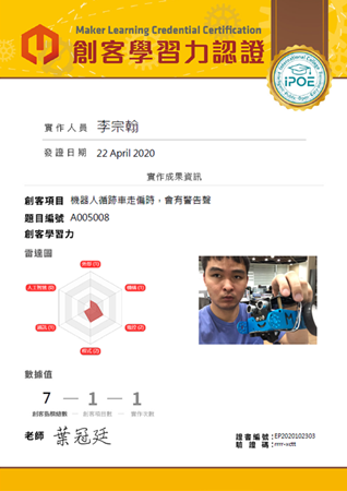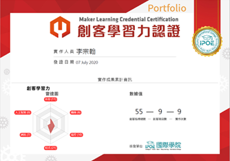 學生每完成一次作品,所獲得的相對應指標分數將會累加,平台會將這些歷程記錄下來並儲存於雲端,當學生有需要這些證明時就可以自行從平台下載紙本作為學習歷程證書。其中呈現出來的歷程包含創客指標總數、創客項目數以及實作次數。除了這三種數據值外,創客指標總數也會以雷達圖方式呈現,學生可以利用這些數據對自己的學習成果進行反思,了解自己的學習傾向,繼續加深學習或是針對其他能力指標進行加廣學習,在高中階段可以為申請入學做準備,在國中小階段則可作為性向與職涯探索的有效工具。