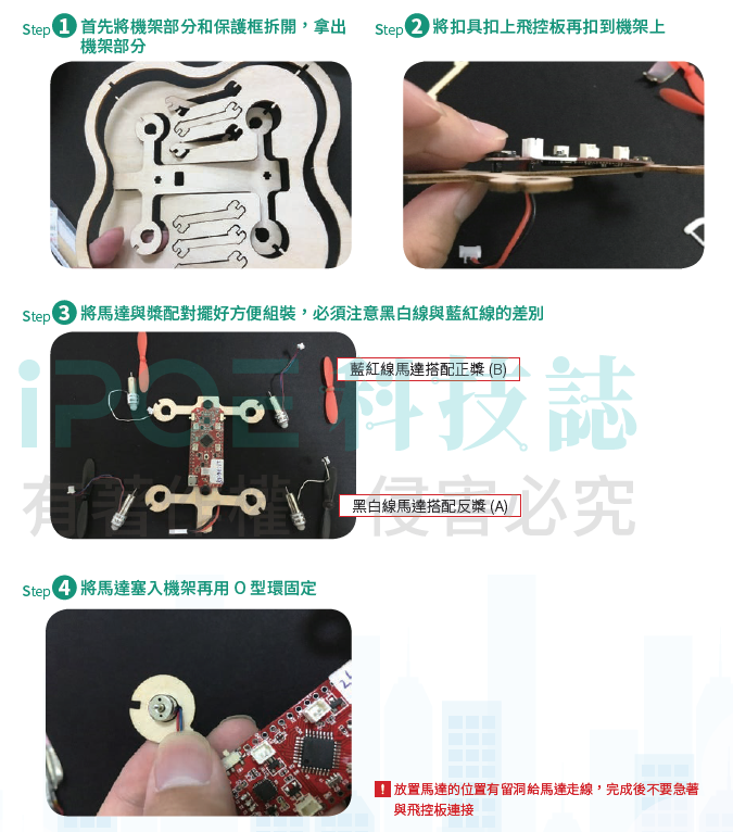 這套四軸飛行器的組裝非常適合初學者或是國中小的學生,在組裝過程中也不需要用到其他工具就能夠輕鬆組起來。接下來就用圖片帶領大家組裝。