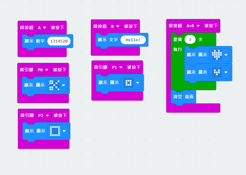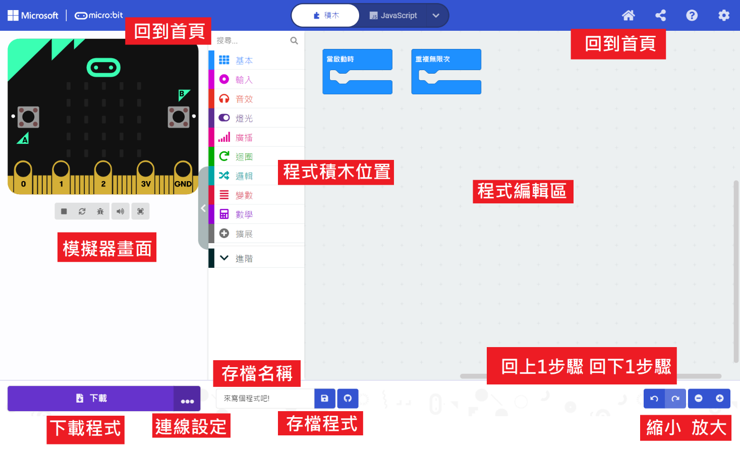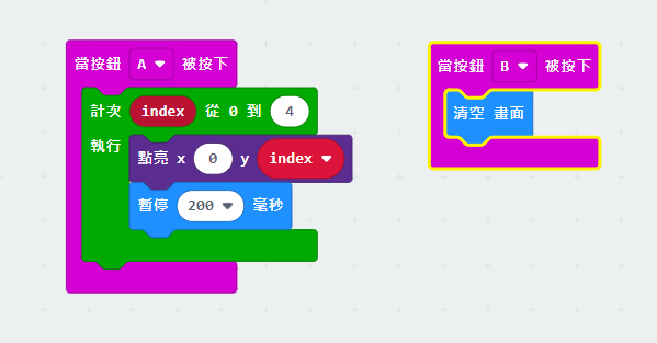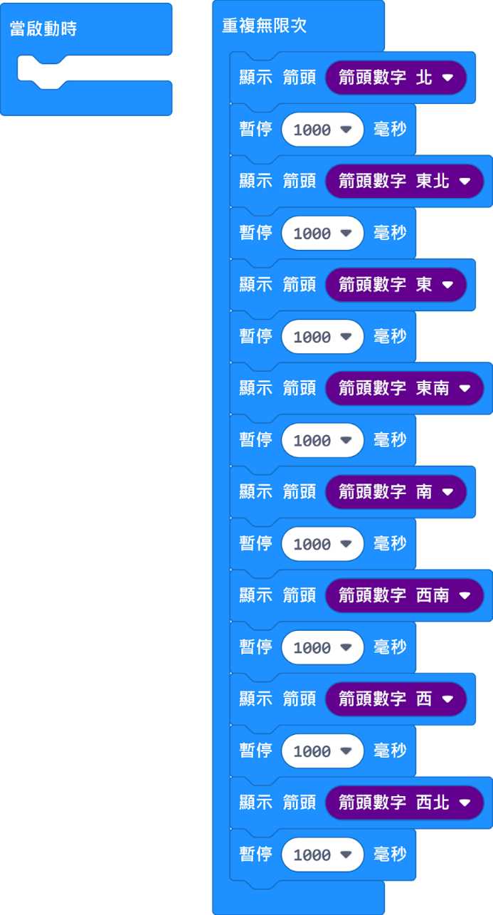 開啟新專案 練習1 指針轉圈圈 基本的積木應用 時間的重要性 圖案 數字 英文字母=文字 25點的圖案設計 內建40個圖案 | ![]() |