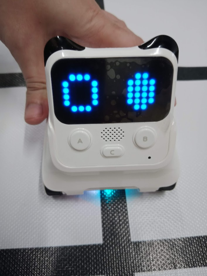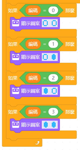 如果只以編碼變數紀錄當下感測器黑白線的狀態,進入上傳模式後變數狀態無法及時在電腦端顯示,就很難檢測機器判斷黑白線的結果是否準確,在此我使用程小奔的LED陣列畫兩個眼睛,用空心/填滿的眼睛對應白底/黑線,即時反應感測器現在判斷的狀況。