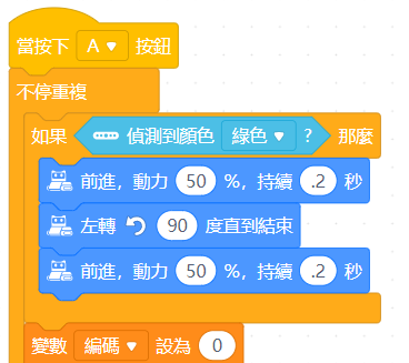接著,就是當遇到色卡時該如何處理,在此示範遇到綠色色卡左轉的方法,由於色卡的優先級高於循線,因此將顏色判斷的程式置於迴圈的最前段,在判斷到綠色的反應流程中,除了主要的"左轉90度直到結束",前後還加入了"前進動力50%持續0.2秒",會多加這兩個前進動作其目的有二,讓車體轉彎90度不是問題,但必須讓車體在"轉向後能重新對到黑線",才能夠接續循線,並且"離開色卡避免重複判讀",以免對一張卡片做兩次動作,不同動作所需的修正量不盡相同,參賽者須自行調整以達到最高效率。