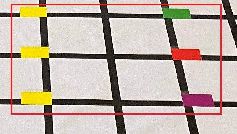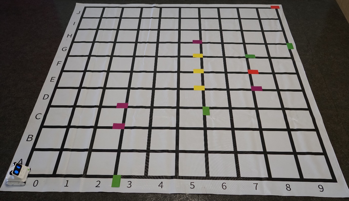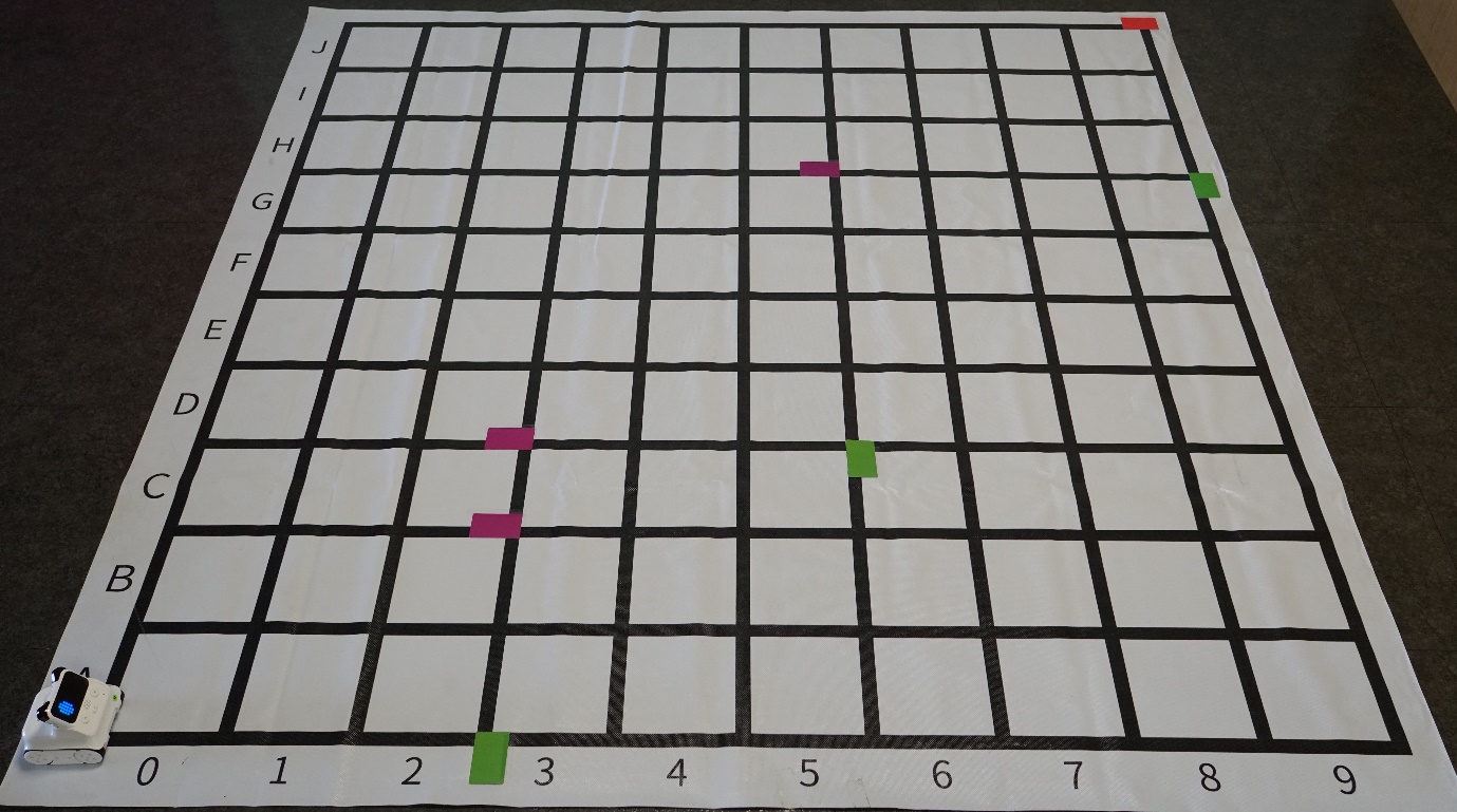 首先是賽場布置,會用到一張網格地圖,以及3組標準色卡,每一套程小奔會附贈一組8張標準色卡,因剔除了地圖用的黑白色,以及容易被機器混淆的藍、青色,比賽中只會用到綠、紫、紅、黃等卡片,如卡片不夠可考慮以顏色相近的色紙代替。