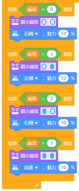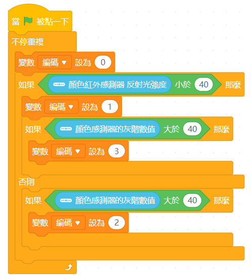 接著我們以40為兩感測器在判斷黑白線分界值,並以左右兩側分別踩在黑線或白線分出四種狀況,並以單一變數對四種狀況進行編碼,編碼數值與對應的狀況列表如下。