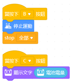 另外在練習過程中,常會需要取回車體重新調整,為避免拿在手上時輪胎還在轉動,可做出按下B按鈕停止運轉的功能,以及為時時注意電池電量,可按下C鍵後顯示電量,避免忘記充電。