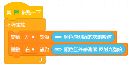 在循線時需要左右兩邊感測器共同協作,才能提供穩定的循線功能,因此需要同時使用"顏色紅外感測器 反射光強度"與"顏色感測器的灰階數值"兩個程式塊,為了要詳細觀察到左右兩個感測器的數值,暫且先改為及時模式,並以兩個變數儲存兩變數。