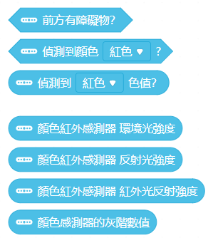 接著,我們要來深度認識小奔上的各個感測器,下列是關於小奔改測器的各個程式塊,在循線時感測器方向朝下,因此不討論感測障礙物的方塊,感測顏色與灰階值功能,是由左側的光線感測器負責,剩餘的"顏色紅外感測器"等三個功能,皆是由紅外線接收器完成。