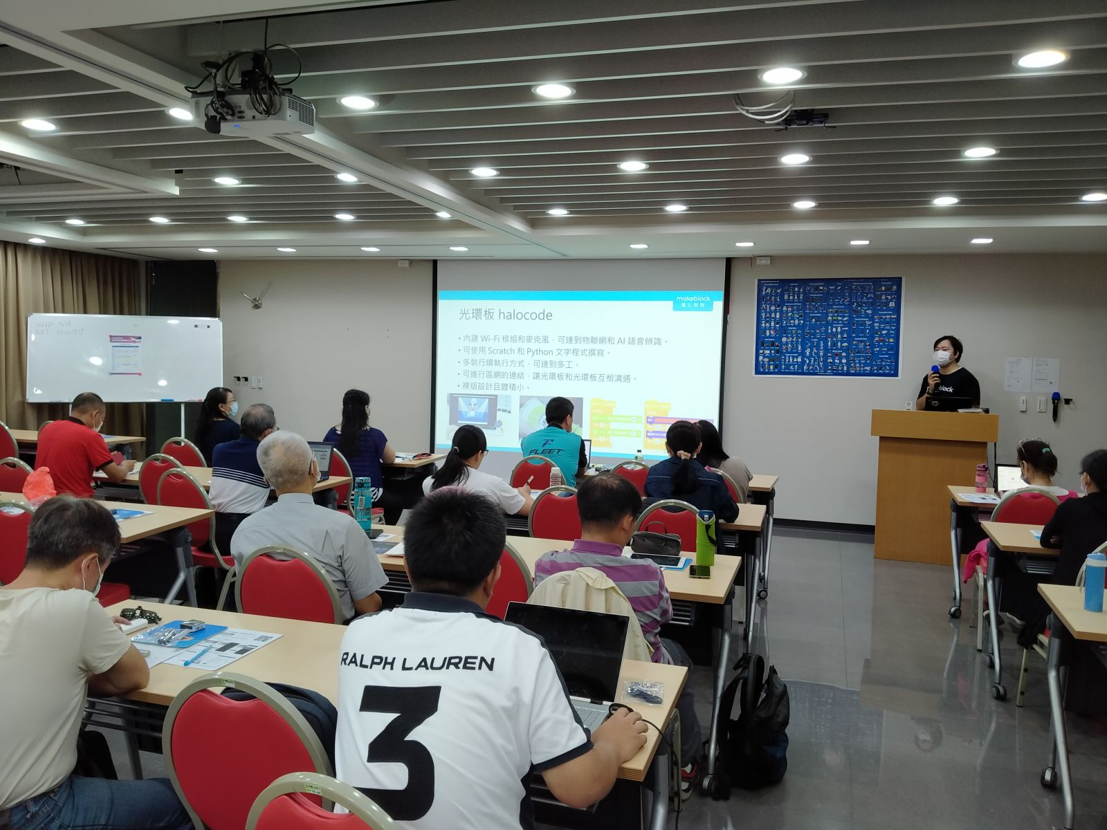 資深原廠講師Eddie下午帶領參加教師使用mblock慧編程撰寫python,搭配激光寶盒、光環板製作出光彩四射的招財貓手機架,老師既可體驗跨領域學習樂趣,亦可將此示範課程帶回學校,鼓勵學生學習的好點子。課程結束後,參加教師只要將本人和作品合照上傳創客學習力系統平台,即可獲得創客學習力單張證書,留下學習紀錄。